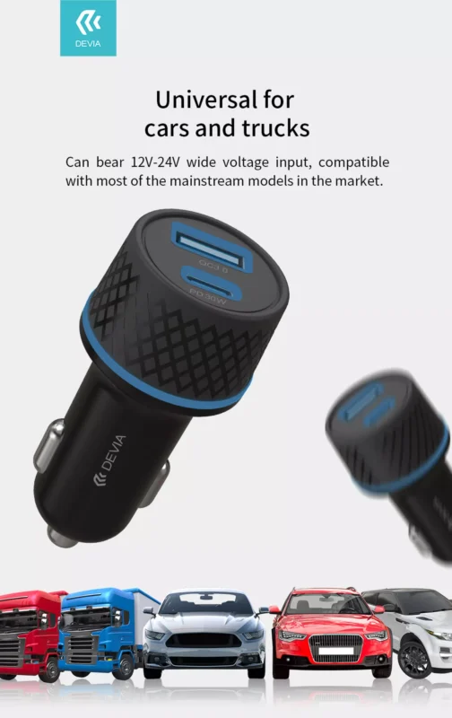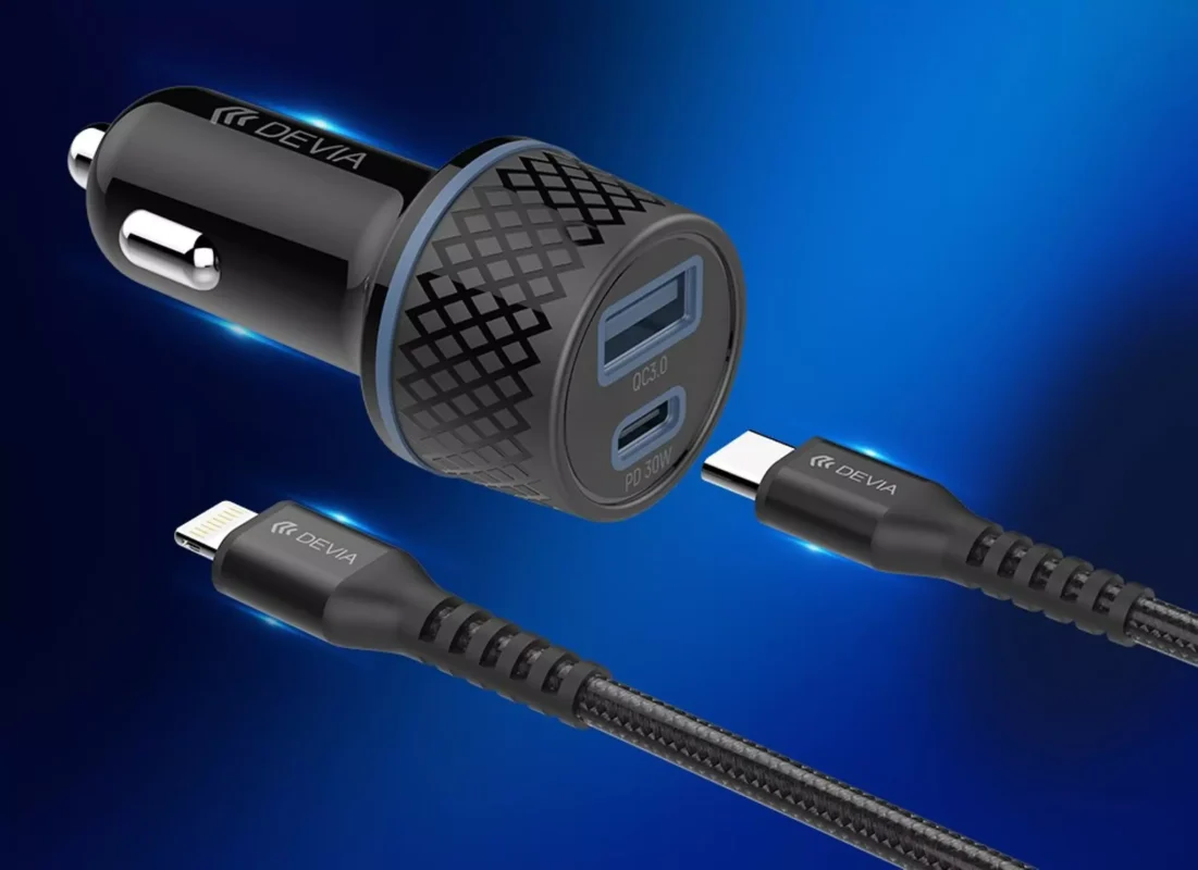 Devia – 30W Power Delivery USB-C & Qualcomm 3.0 USB Port Car Adapter & 1m USB-C to Non-MFI Lightning Cable – Black